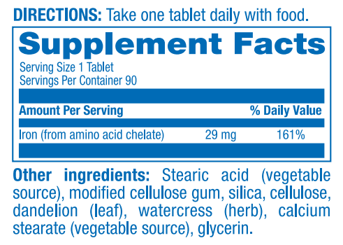 This chelated form of iron can be better absorbed by the body. Additional iron may be needed for pre-menopausal women, vegetarians or individuals consuming limited animal protein.
