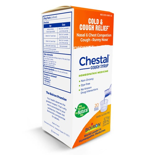 Boiron Chestal Cold & Cough conveniently targets both common cough and cold symptoms with homeopathic medicines. The sweet-tasting multi-symptom syrup relieves nasal and chest congestion, dry fitful cough, sneezing, minor sore throat, and runny or stuffy nose.* It does not interact with other medications or supplements, and there’s no risk of a rebound effect. Chestal Cold & Cough is dye-free, 99.9 percent alcohol-free, and non-habit forming. It won’t mask symptoms of a more serious condition.
