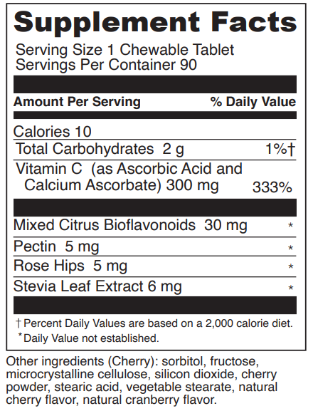 Vitamin C with Bioflavonoids in great tasting cherry flavored chewable tablets. This product is excellent for children and people who have difficulty swallowing tablets. YEAST FREE.