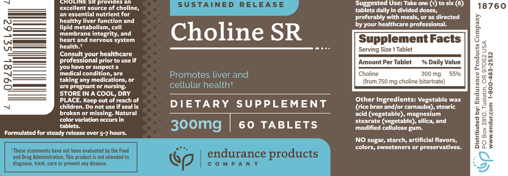 Choline SR provides an excellent source of choline with 300mg per tablet. As a building block for phosphatidylcholine, choline supports cell membrane integrity and cell signaling, fat digestion and liver function and lipid metabolism.*