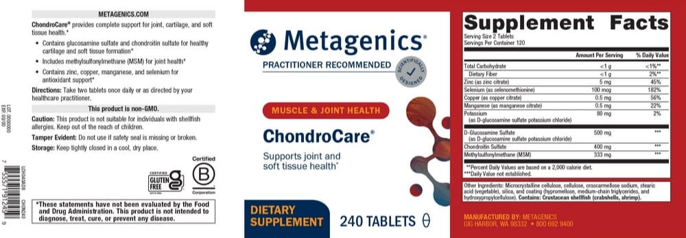 ChondroCare® is designed to provide broad support for healthy joints by featuring high quality glucosamine sulfate and chondroitin sulfate, nutritional factors known to help support cartilage health and soft tissue formation. This well-rounded formula also features methylsulfonylmethane for joint health as well as zinc, copper, manganese, and selenium for antioxidant support.*