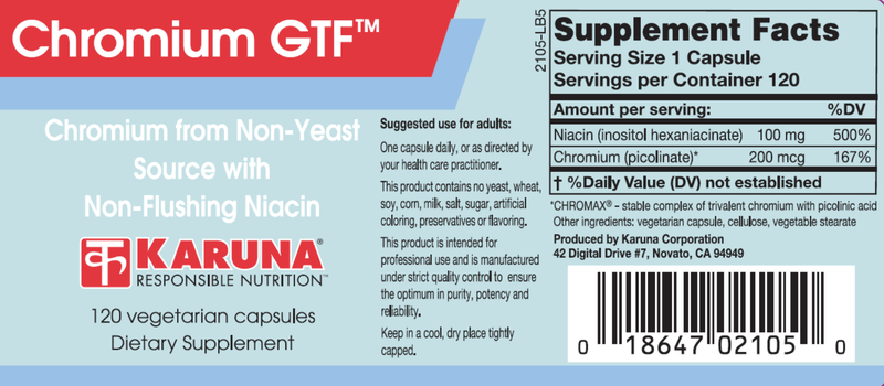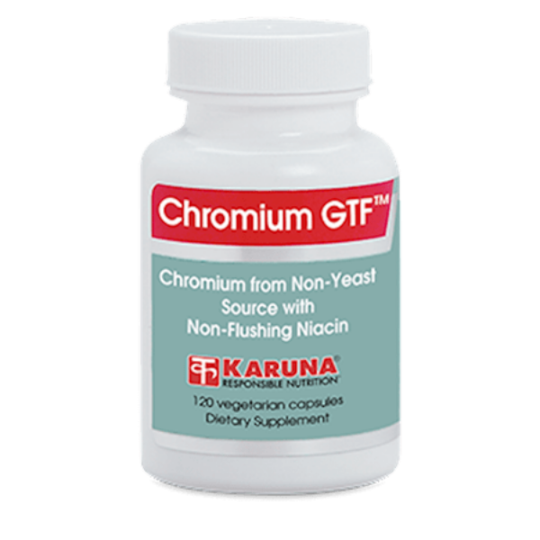 Chromium GTF has repeatedly shown its ability to support insulin function and blood glucose levels already in the normal range. In addition to a highly bioavailable chromium complex not associated with yeast sources, Karuna's Chromium GTF contains 100 mg of inositol hexaniacinate (non-flushing niacin) in a synergistic combination that has been shown effective for maintaining healthy blood levels of both glucose and lipids.*