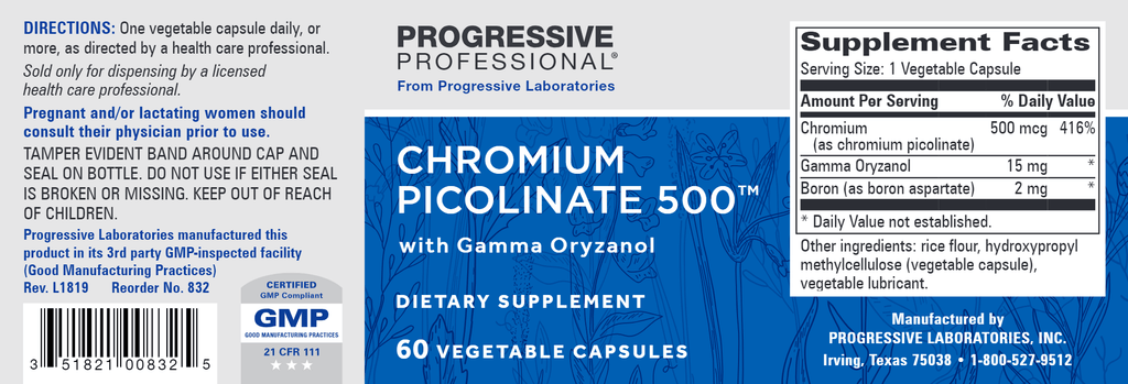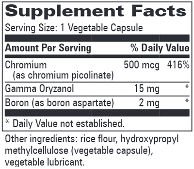 Organic chromium, an active component of GTF (glucose tolerance factor), supports the efficient use of insulin and, therefore, normal blood sugar levels. This highly absorbable form of chromium also supports weight management and lean muscle mass when used with diet and exercise programs. Chromium Picolinate 500 adds boron and gamma oryzanol to further support lean muscle mass.