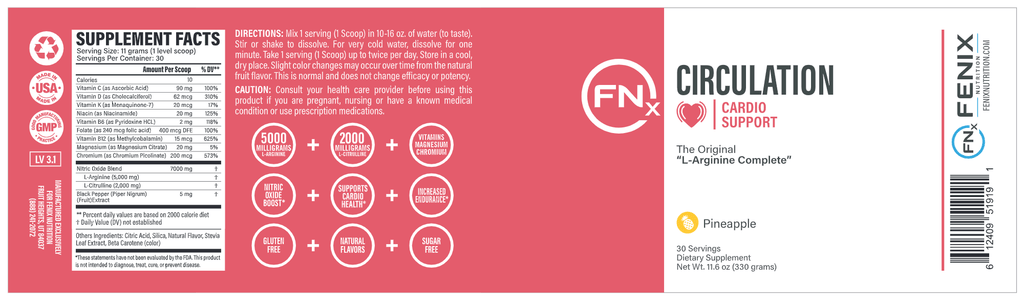 Circulation (Cardio Support) is a Nitric Oxide Formula, consisting of an L-Arginine and L-Citrulline blend to provide a prolonged daily nitric oxide boost.