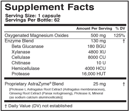 CLEANSXYM™ is a proprietary blend of oxygenated magnesium in a base of protein/carbohydrate/fiber digesting enzymes designed to facilitate the cleansing and elimination process in the lower intestinal tract.