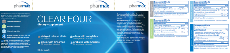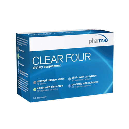 Clear Four is a unique combination of human-sourced probiotics, allicin, cinnamon, N-acetyl glucosamine (NAG), L-glutamine, and beta-carotene. The probiotic formulation used in Clear Four contains 25 billion CFU of human-sourced probiotics that support optimal gastrointestinal health. Allicin and cinnamon help to maintain a natural healthy gut flora. Studies indicate that L-glutamine helps to maintain normal intestinal barrier function by supporting intestinal barrier permeability.