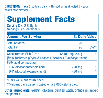 Molecularly distilled, concentrated EPA/DHA fish oil sourced from cold water fish. A 1200 mg fish oil softgel containing 360 mg EPA and 240 mg DHA. Molecular distillation process ensures that no pesticides, PCBs or heavy metals are present. Also includes a natural mix of tocopherols for additional antioxidant protection and orange oil for a pleasant flavor.