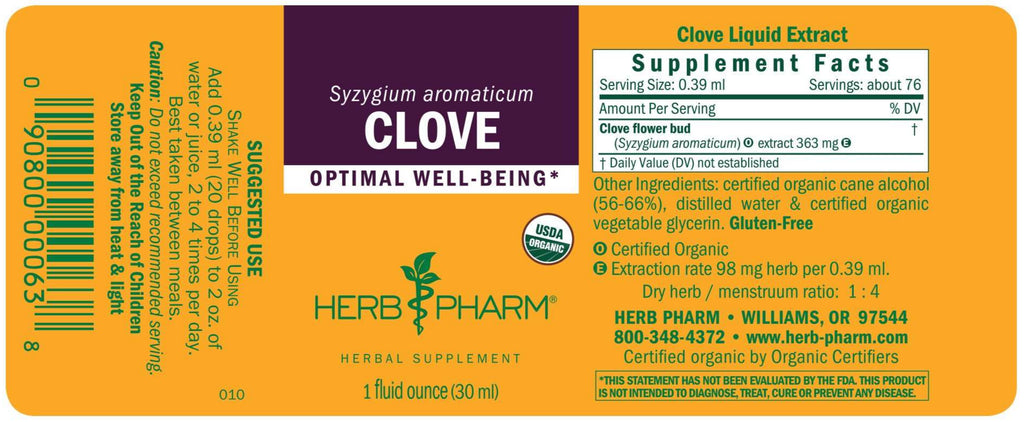 Herb Pharm prepares Clove extract from the flowering bud of Syzygium aromaticum trees. To assure optimal extraction of the herb’s bioactive compounds, the flower buds are hand-harvested when their color changes from green to crimson, carefully dried to retain their full aroma and flavor, then thoroughly extracted. Clove is processed in sealed vessels to retain the herb’s essential oils and aromatic properties.