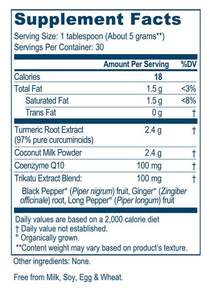 COCURCUMIN™ is a natural coconut flavored drink mix that uses traditional methods to enhance the bioavailability of curcuminoids. Curcumin is difficult for the body to absorb. Absorption of curcumin has been shown to improve when it is consumed with fats, which enhance absorption since curcumin is highly lipophilic. Adding medium-chain triglycerides (MCTs), as we have done in our CoCurcumin™ formula, significantly improves the bioavailability of curcumin. MCTs are a unique form of dietary fat that impart a wide range of positive health benefits including supporting fat metabolism and energy production. Trikatu is a traditional Ayurvedic combination for digestive health containing piperine from black pepper. Piperine has also been shown to enhance turmeric absorption.