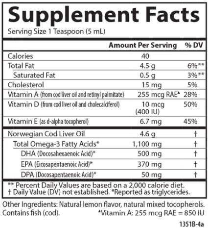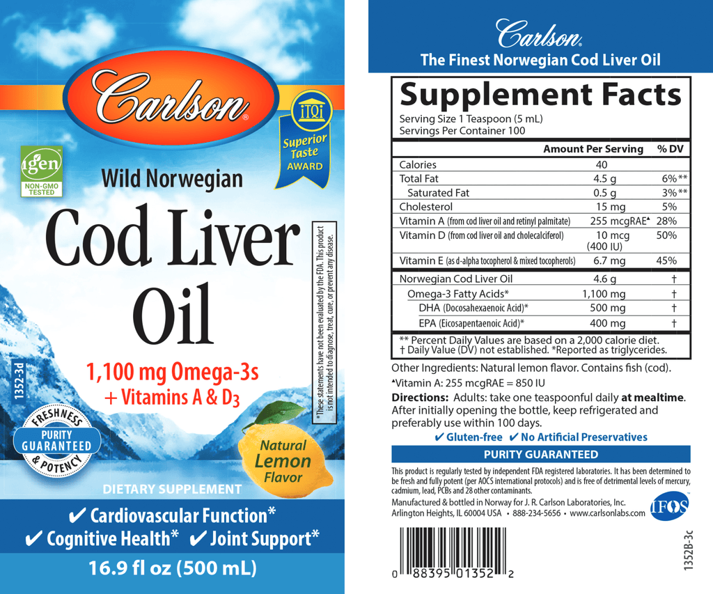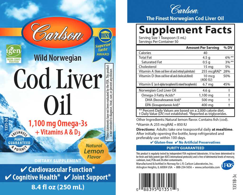 Carlson Cod Liver Oil has received numerous awards for its taste and quality. A single teaspoonful provides 1,100 mg of omega-3s, including EPA and DHA, which support heart, brain, vision, and joint health. To ensure maximum freshness, Cod Liver Oil is closely managed from sea to store.