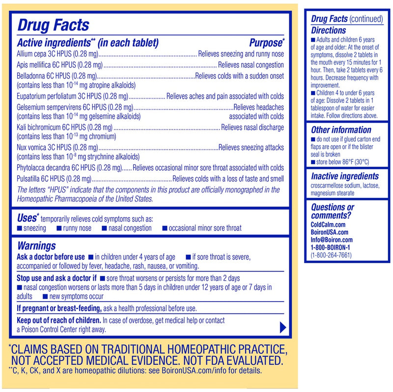 Unlike conventional medications that mask full-blown symptoms, Boiron ColdCalm tablets target specific cold symptoms at the onset, established and resolution stages of the common cold. This homeopathic cold medicine is easy to take at first sign to relieve sneezing, runny nose, nasal congestion, and minor sore throat pain.* The tablets dissolve quickly under the tongue without water, chewing, or swallowing pills. It’s non-drowsy and does not interact with other medications or supplements. Coldcalm is not habit-forming and there’s no risk of a rebound. It won’t mask symptoms of a more serious condition.
