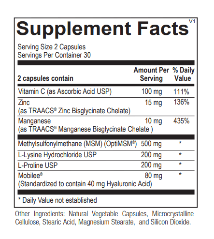 Targeted Cofactors: Zinc is an essential trace mineral that supports DNA synthesis, cell division, cell membrane structure, immune function, and protein synthesis. Requirements are highest when the body’s repair system is most active. MSM is responsible for the flexible disulfide bonds between cells, including those that make up connective tissue and the skin. It blocks undesirable chemical and physical cross-linking of collagen and preserves connective tissue pliancy, which is crucial for supporting healthy collagen. MSM has been shown to significantly increase plasma glutathione levels, an additional benefit in maintaining collagen’s defensive mechanisms against oxidative stress. Multiple clinical studies also show that MSM, in combination with other joint health ingredients, supports tendon and joint health. Manganese assists the growth and development of normal bone and the synthesis of cartilage. Manganese is also a structural component of antioxidant enzymes, and aids in amino acid production. During the tissue synthesis process, which requires an increased production of collagen, manganese is required for the activation of prolidase, an enzyme that functions to provide the amino acid proline, for collagen formation in human skin cells. Nutritional co-factors required for tissue regeneration include zinc, vitamin C and amino acids. Inadequacy of these nutrients impacts endogenous collagen production and connective tissue synthesis.