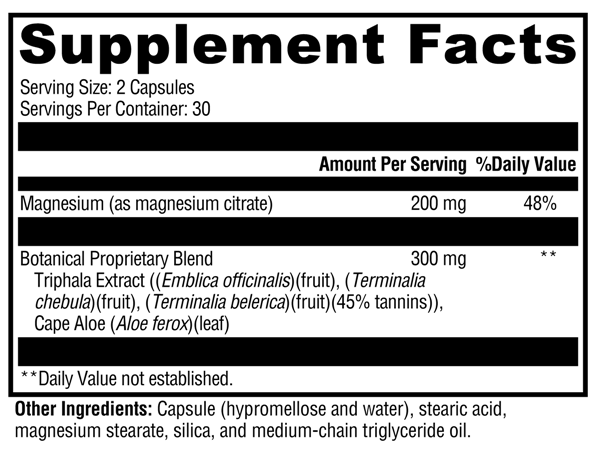 ColonX™ is designed to support gastrointestinal (GI) regularity and complement dietary fiber intake. Magnesium citrate is present to support muscle relaxation and bowel elimination. Cape Aloe is added to support normal GI transit time and stool bulk. Triphala, a balanced blend of astringent fruits used extensively in Ayurveda, is present to support all phases of digestion, assimilation, and elimination. Gastrointestinal regularity in turn plays a fundamental role in detoxification, providing a major route for elimination of toxins.*