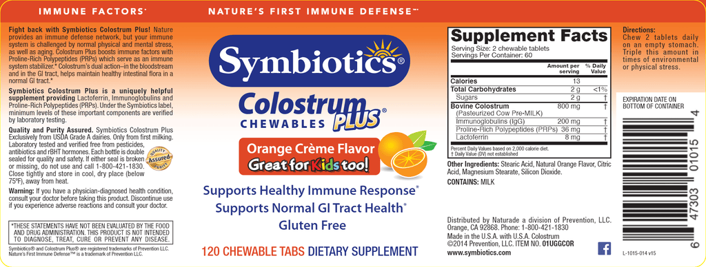 Symbiotics Colostrum Plus features key natural Immune Factors such as Immunoglobulins, which are types of proteins that are used by the immune system to identify and neutralize foreign objects, as well as Lactoferrin, which is a multifunctional protein and Proline-Rich Polypeptides, which have a very powerful effect in supporting the immune response.*