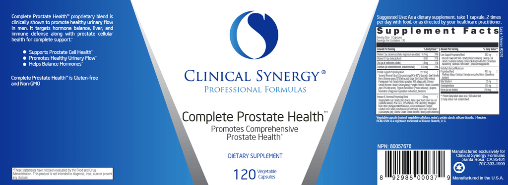 Clinical Synergy® Complete Prostate Health is a comprehensive formula providing 33 beneficial ingredients including highly prized botanical compounds, botanically enhanced mycelium from organically grown mushrooms, vitamins, minerals and specialty nutrients. These standardized botanical extracts provide optimal concentrations of ingredients.