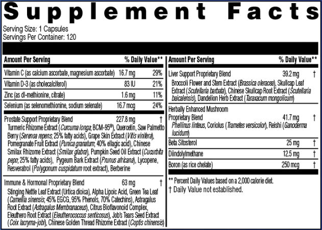 The formula features four proprietary blends that complement essential vitamins, minerals and specialty nutrients to provide targeted benefits for overall prostate health, including promoting removal of excess estrogens and xenoestrogens for healthy hormone balance, nourishing the liver and supporting immune function.*