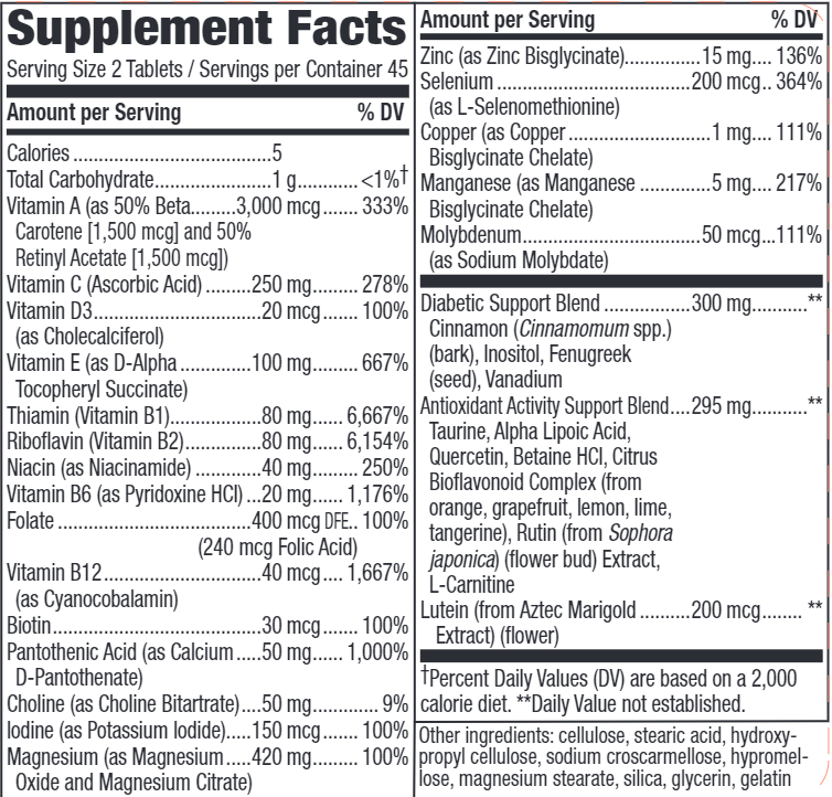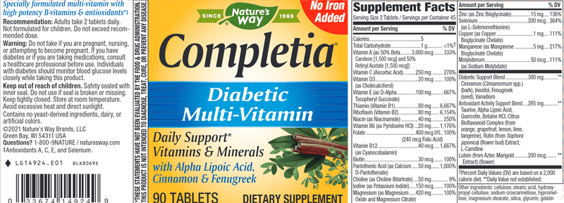 People with diabetes have special nutritional needs. Completia is a complete daily multivitamin, specially formulated with high potency B-vitamins and antioxidant vitamins A, C, E, and selenium. It contains important vitamins and minerals essential for general wellness, plus special Plant-Powered Herbal and Antioxidant Activity Blends featuring beneficial ingredients including alpha lipoic acid, cinnamon, and fenugreek.