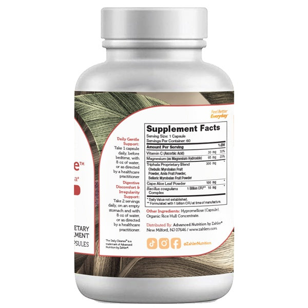 The Daily Cleanse contains a powerful blend of specialized probiotics and digestion-regulating compounds, such as Triphala, Cape Aloe, Baccilus Coagulans and more, to relieve constipation and help move the ’process of elimination’ along naturally and regularly.*
