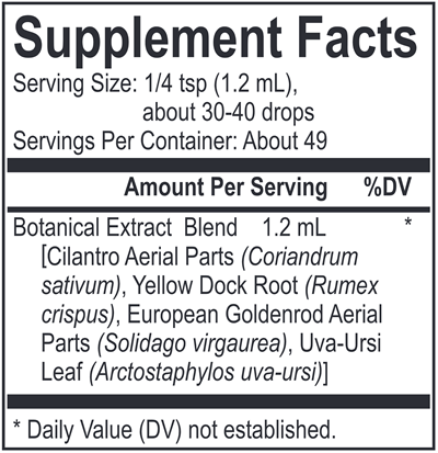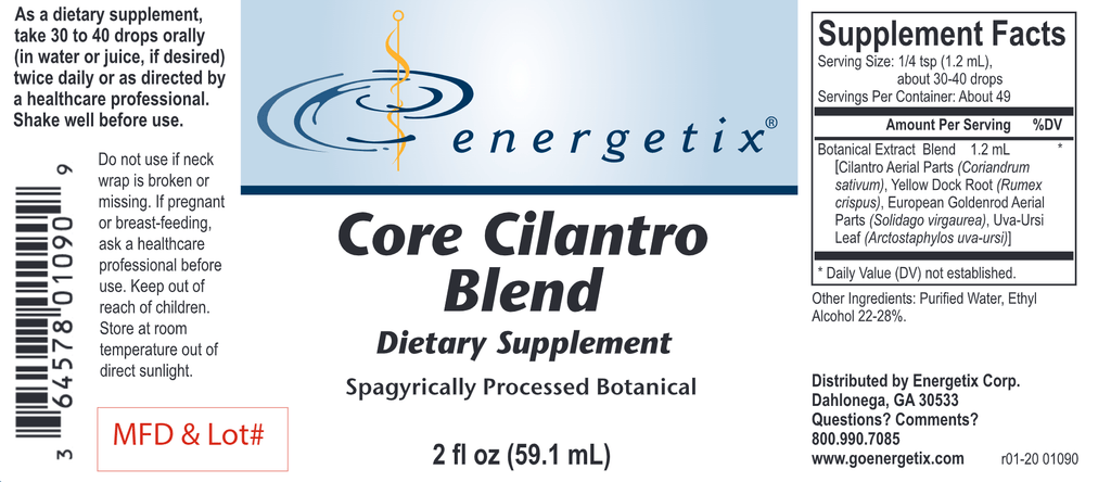 Core Cilantro Blend is a spagyrically processed, botanical blend featuring cilantro (Coriandrum sativum), yellow dock, goldenrod, and other herbs that supports the normal excretion of heavy metals and healthy elimination pathways (liver, kidney).