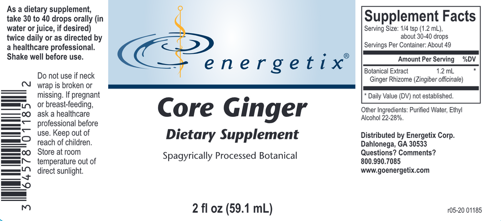 Core Ginger is a spagyrically processed botanical extract of the Zingiber officinale rhizome (underground stem) that supports normal digestion, assimilation, gastrointestinal function. and healthy immune and inflammation responses. Additionally, ginger has a warming quality that complements the actions of other herbs.