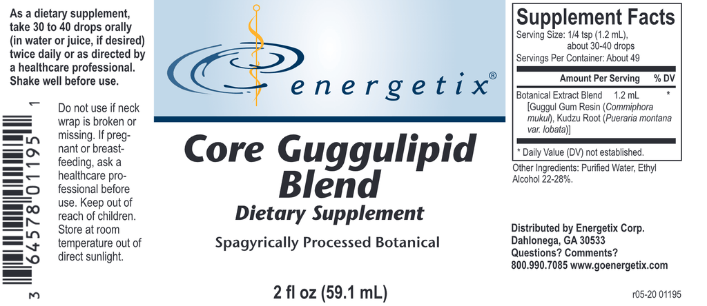 Core Guggulipid Blend is a spagyrically processed botanical blend of Commifora mukul (guggul) resin and kudzu root designed to support healthy lipid balance, normal blood sugar, and healthy circulatory and vascular performance.