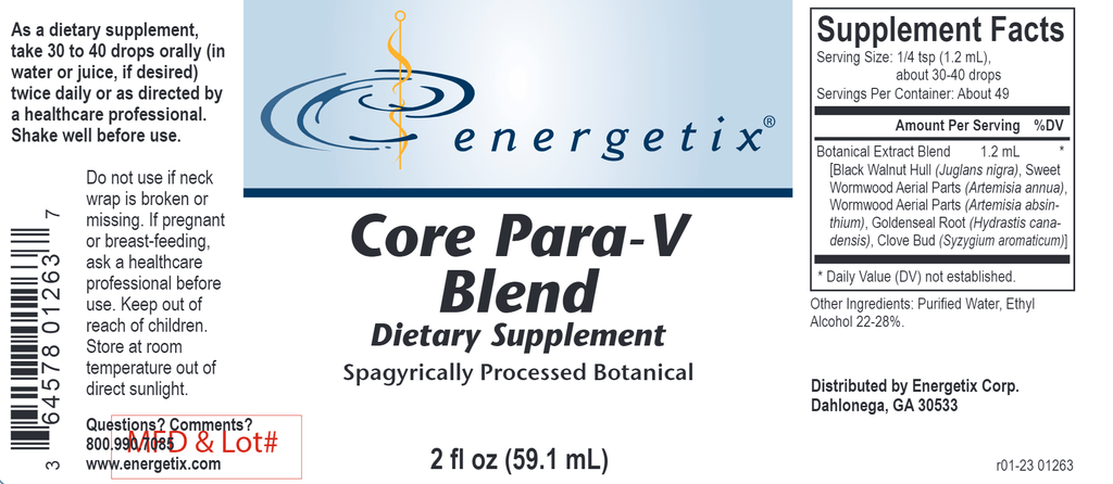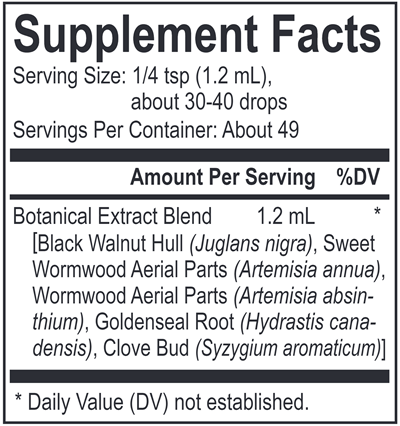 Core Para-V Blend is a spagyrically processed botanical blend featuring Artemisia absinthium (wormwood), Artemisia annua (sweet wormwood), black walnut, clove bud, and goldenseal designed to support an intestinal landscape inhospitable to parasitic worms (helminths), normal liver, and gastrointestinal function and healthy microflora.