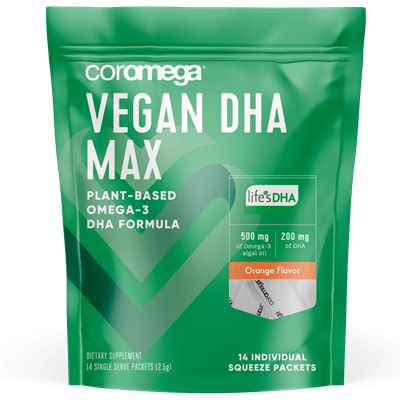 New Coromega Vegan DHA Max, made with algal oil for a super tasty plant-based way to get your DHA omegas! We use 500mg of life’s DHA and our unique squeeze delivery system to provide oxidation protection, great taste, better absorption and on the go convenience.