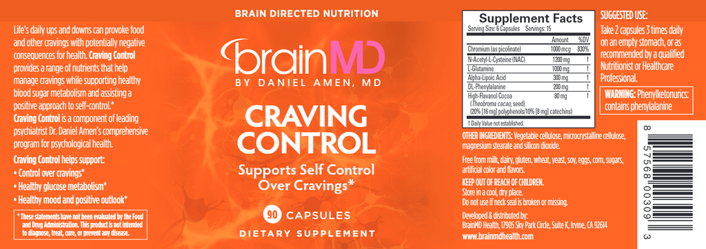 Life’s daily ups and downs can provoke food and other cravings with potentially negative consequences for health. Craving Control provides a range of nutrients that help manage cravings while supporting healthy blood sugar metabolism and assisting a positive approach to self-control.* Craving Control is a component of leading psychiatrist Dr. Daniel Amen’s comprehensive program for psychological health.