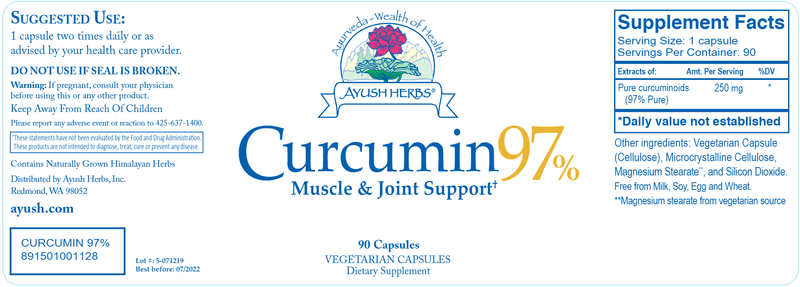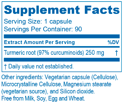 CURCUMIN 97%™ (the active constituent of turmeric) has been used for centuries in foods for its health-supporting benefits such as maintaining healthy inflammatory and metabolic responses. Curcumin helps to maintain healthy inflammation through multiple cellular mechanisms. It is also known to have important antioxidant properties and helps support the body’s natural detoxification, liver, and cognitive functions. In this purified form without enhanced absorption curcuminoids are most helpful for gastrointestinal health.