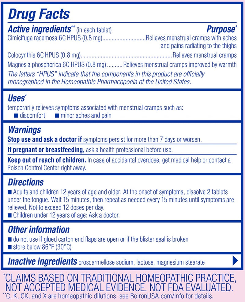 As a homeopathic medicine, Cyclease Cramps is free of stimulants, such as caffeine (used as a diuretic to help with water retention) and sedatives (antihistamines). Take day or night without worry of drowsiness or sleeplessness and hyperactivity. Cyclease is also NSAID-free, so it won’t upset your stomach or cause an allergic reaction. It has no known drug interactions and is made without any artificial colors, flavors, sweeteners, or preservatives.