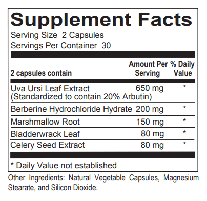 Uva Ursi: The leaves of uva ursi (Arctostaphylos uva ursi) have been used for centuries in herbal medicine to support the health of the urinary tract. The medicinal portion of uva ursi is the dried leaves, which, in addition to providing arbutin, have methylarbutin, flavonoids, allantoin, tannins, gallic and ellagic acids, volatile oils and a resins (urvone). Each of the components in uva ursi leaf work synergistically with arbutin to promote healthy bacteria balance in the urinary tract. Additionally, the components of the uva ursi leaf prevent the breakdown and improve absorption of the arbutin molecule. When arbutin remains intact, it is excreted through the kidneys and provides microbial support for urinary tract mucous membranes. Research has demonstrated uva ursi’s ability to promote microbial balance in the bladder and ability to flush out the urinary tract.