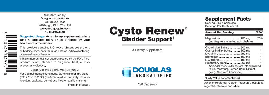 Cysto Renew®, developed by Dr. Geo Espinosa, is a unique combination of ingredients designed to help calm the bladder and support healthy functioning of the urinary tract system.† Each ingredient researched by Dr. Espinosa, a naturopathic physician specializing in urology, contributes to the health of the bladder glycosaminoglycan layer, nitric oxide production, healthy stress response, and normal mast cell production that helps promote a healthy functioning bladder and normal urine frequency.
