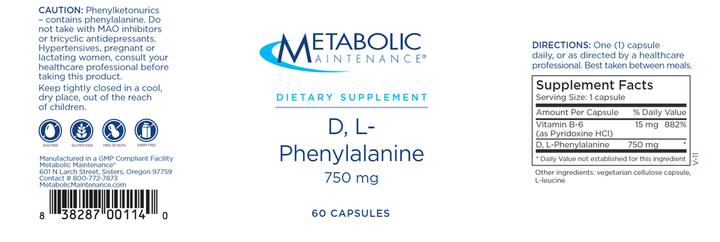 L-Phenylalanine is an essential amino acid that is converted to tyrosine. It follows the catecholamine pathway and is a precursor to thyroid hormone. L-Phenylalanine helps support the normal production of mood-elevating chemicals in the brain such as dopamine and norepinephrine. D-Phenylalanine helps to naturally reduce pain signals in the nervous system. The combination of the two forms may help support normal mood and address physical discomforts. It should not be used with MAO inhibitors or tricyclic antidepressants, or by patients who have PKU, or hypertension.