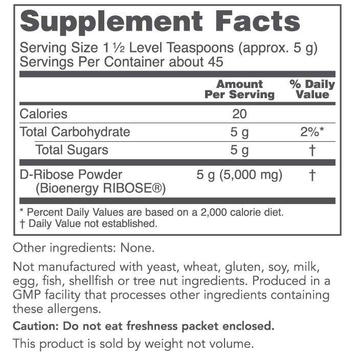 Ribose is a pentose sugar found in all living cells and is a structural component of nucleotides such as DNA, RNA, and ATP.* ATP is the ultimate source of energy for all cells, and is necessary for all muscle movement.* Ribose has been clinically researched for its role in the support of adenosine triphosphate (ATP) production within skeletal muscle and for the maintenance of healthy cardiac energy metabolism.* These studies indicate that ribose can help to sustain ATP production in these vital tissues.* Bioenergy RIBOSE® is a registered trademark of Bioenergy Life Science, Inc. Use of ribose is licensed by Bioenergy Life Science, Inc. under U.S. patents and foreign patents issued and pending.