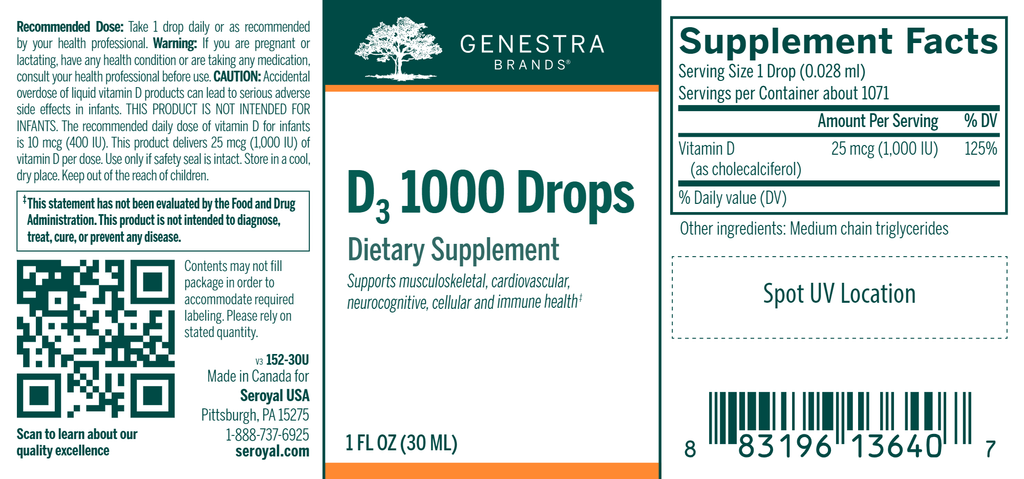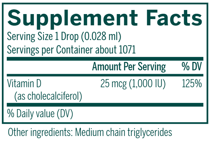 The recommended daily dose of vitamin D for infants is 10 mcg (400 IU). This product delivers 25 mcg (1,000 IU) of vitamin D per dose. Use only if safety seal is intact. Store in a cool, dry place. Keep out of the reach of children.