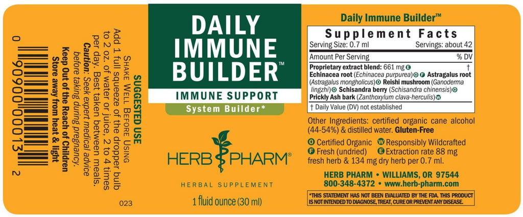 Daily Immune Builder features Echinacea extracted from the root of Certified Organic Echinacea purpurea plants grown on farms in southern Oregon. It also features Astragalus prepared from the root of Certified Organic Astragalus mongholicus plants.