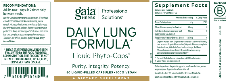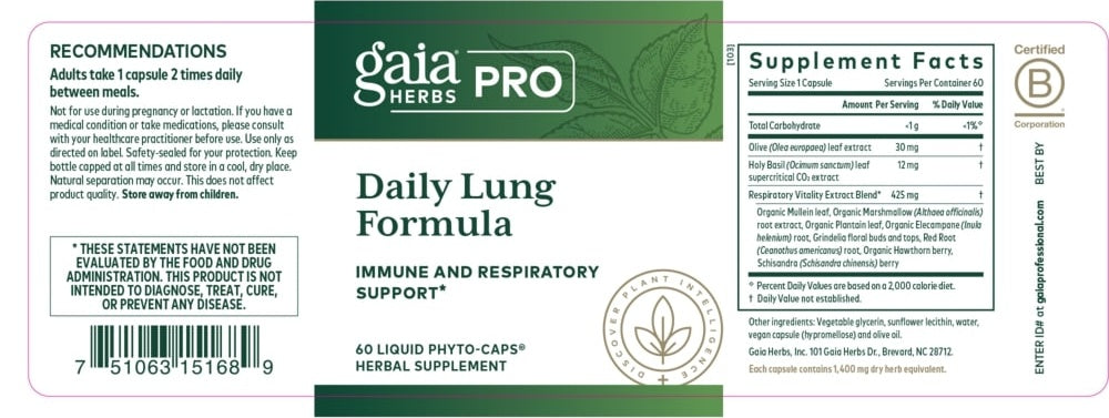 It’s more important than ever to prioritize lung health. Heightened immune challenges and exposure to environmental pollutions are taxing on the lungs. Daily Lung Formula’s powerful blend combines adaptogenic and respiratory-supporting herbs to support long-term lung health and easy breathing.* Made with Mullein, Gaia-grown® Plantain, Schisandra, and Elecampane.