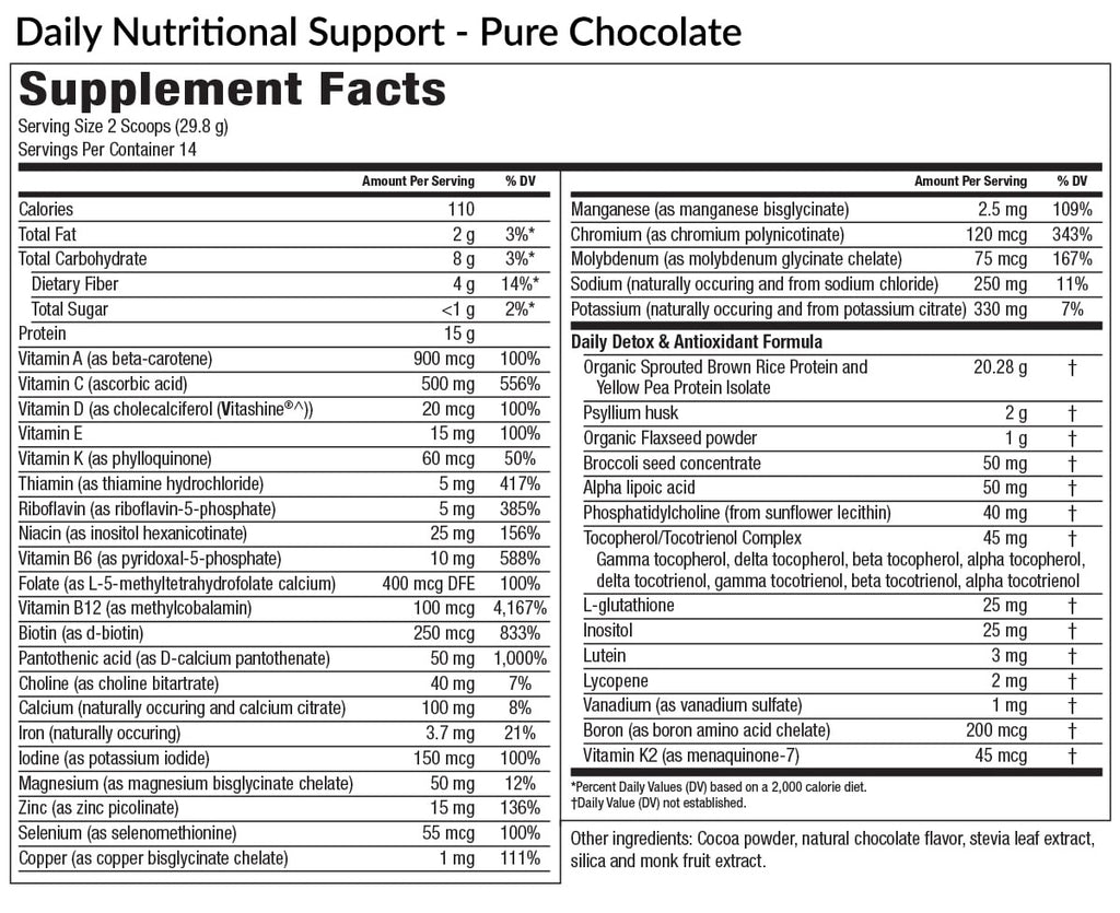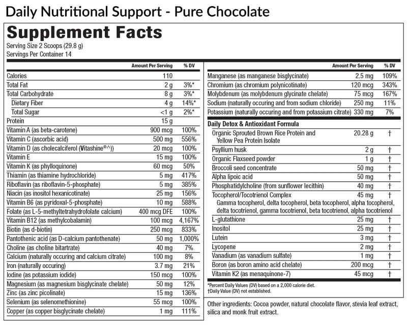 While many protein supplements only deliver protein, our Daily Nutritional Support also provides carefully formulated amounts of the recommended micronutrients (vitamins and minerals) needed daily for our body to function at its best. This powerful nutritional blend also includes beneficial antioxidants that help promote healthy skin and bones, support protein synthesis, plus the ongoing maintenance and performance of essential daily functions. Many of the vitamins come in an activated, methylated form, which are the easiest form for the body to absorb and utilize efficiently. A blend of electrolytes is added to boost energy, support hydration, and optimize daily detoxification.