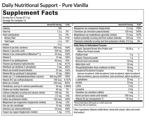 While many protein supplements only deliver protein, our Daily Nutritional Support also provides carefully formulated amounts of the recommended micronutrients (vitamins and minerals) needed daily for our body to function at its best. This powerful nutritional blend also includes beneficial antioxidants that help promote healthy skin and bones, support protein synthesis, plus the ongoing maintenance and performance of essential daily functions. Many of the vitamins come in an activated, methylated form, which are the easiest form for the body to absorb and utilize efficiently. A blend of electrolytes is added to boost energy, support hydration, and optimize daily detoxification.