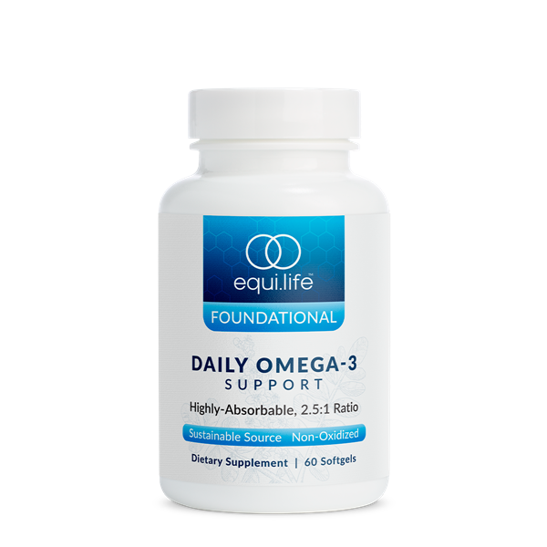 Omega-3 fatty acids are essential for healthy nutrition, yet obtaining high-quality sources through diet alone can be challenging. Omega-3 Support by EquiLife provides 2.5g of sustainably sourced, cold processed, mercury-free, and superior triglyceride formulated fish oil for enhanced absorption. With Omega-3 Support, modulating inflammation, supporting a healthy heart and brain is not only good for you but also good for the planet.