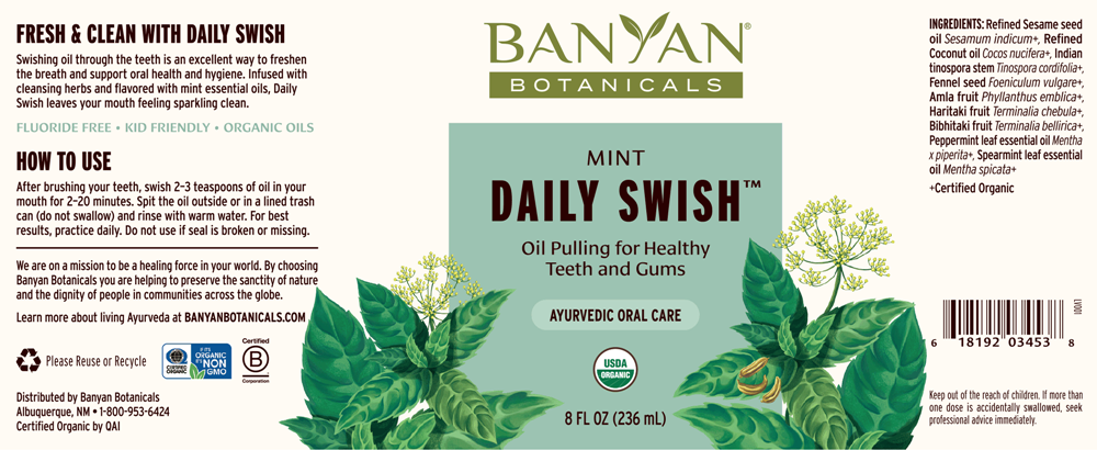 Holding oil in the mouth and swishing or pulling it through the teeth is an excellent way to support oral health and hygiene. Infused with cleansing herbs, including the renowned formula triphala, and flavored with peppermint and spearmint, Daily Swish leaves your mouth feeling clean and fresh.