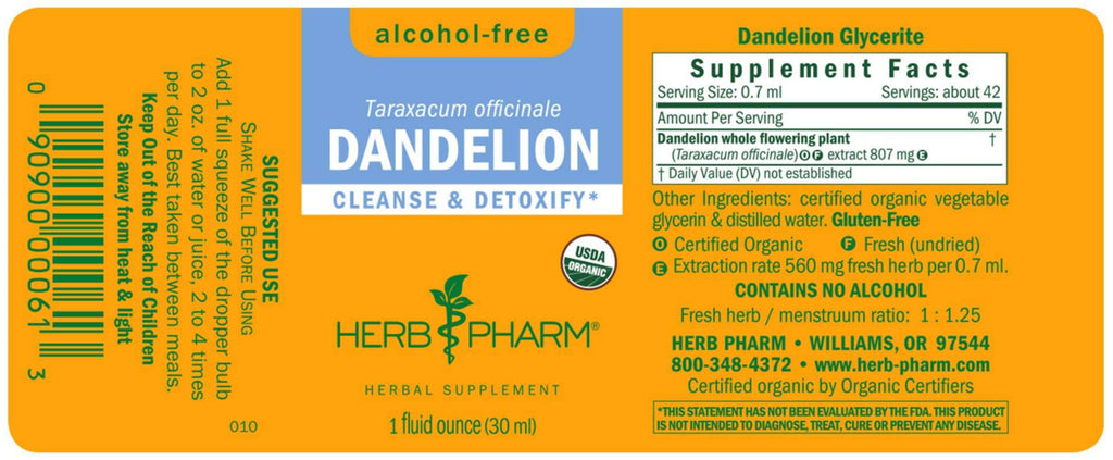 Herb Pharm prepares alcohol-free Dandelion extract from fresh (never dried) whole Certified Organic Taraxacum officinale plants (root, leaf and flower) grown on farms in southern Oregon. The plants are grown in neat rows, are harvested each spring and often have taproots over a foot in length. To assure optimal extraction of the herb’s bioactive compounds, the plants are hand-harvested while in full flower and are then promptly extracted while still fresh and succulent.