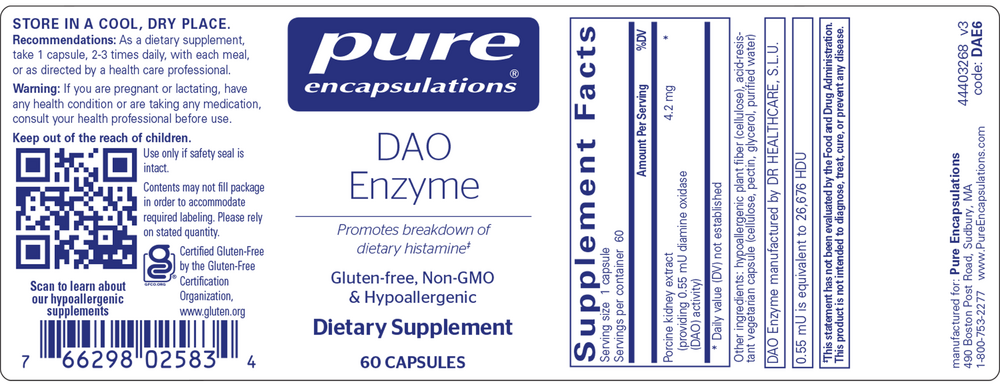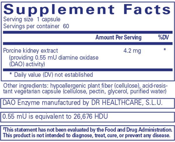 Diamine oxidase (DAO) enzyme promotes histamine breakdown, delivered in an acid-resistant capsule to support digestive health and comfort.