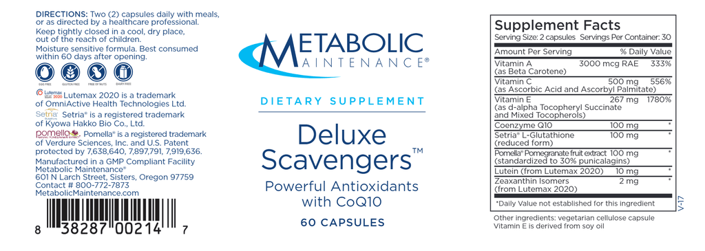 Deluxe Scavengers™ is a premium antioxidant formula providing a wide range of ingredients for support against oxidative stress and free radical damage. Each two-capsule serving contains antioxidant vitamins A, C, and E in superior forms found in nature. That includes natural mixed carotenoids with beta carotene, alpha carotene, cryptoxanthin, zeaxanthin and lutein, both water and fat-soluble vitamin C, naturally sourced vitamin E from d-alpha, and mixed tocopherols. The capsules also contain coenzyme Q10, which is both an antioxidant and a mitochondrial coenzyme necessary for cellular ATP production. Our CoQ10 is the natural, all-trans form made in Japan or the US. Setria® L-glutathione (the body’s master antioxidant) and Pomella® pomegranate extract with 30% punicalagins have also been added to the formula. Punicalagins are the major antioxidants in pomegranate fruit and have been shown to have greater antioxidant activity than resveratrol, green tea, grape seed, goji, or acai.