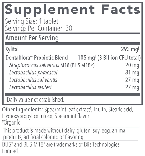 Dentalflora™ has a proprietary blend of science-backed oral probiotics that work at the foundational level – addressing the root causes of oral health concerns. Great-tasting Dentalflora™ supports the health of everything behind your beautiful smile. Helps populate the oral cavity with beneficial bacteria* Helps reduce the formation of dental plaque* Promotes fresh breath — and healthy teeth and gums* Xylitol may help reduce the risk of tooth decay*
