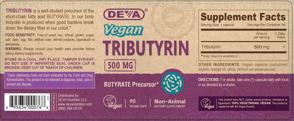 Deva Nutrition is proud to introduce its new Vegan TRIBUTYRIN product with 500 MG potency per vegan capsule. Tributyrin is a well-studied precursor of the short-chain fatty acid BUTYRATE (aka Butyric acid). In the human body, butyrate is produced when good bacteria break down the dietary fiber in our colon.