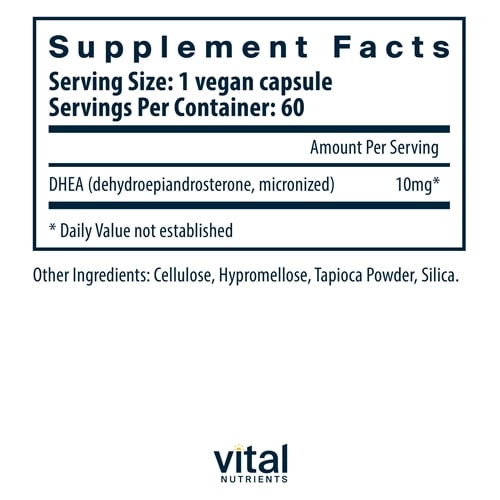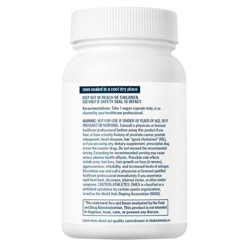 DHEA (Dehydroepiandrosterone) is a hormone produced by the adrenal glands that naturally declines after the age of 30. As a crucial precursor to androgens, supplementing with DHEA can help replenish levels to support healthy aging.* It plays a role in supporting fat, sugar, and mineral metabolism, immune response, energy levels, and maintaining normal estrogen and testosterone levels.* Vital Nutrients’ DHEA is micronized to enhance absorption, making it more effective for supporting hormonal balance and overall health.*