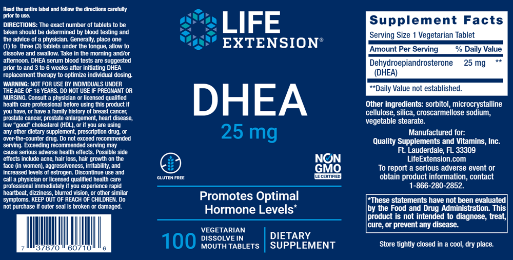 DHEA (Dehydroepiandrosterone) is the body's most abundant circulating hormone. So why take a DHEA supplement? Because DHEA levels can begin to decline over time, and maintaining healthy DHEA levels has whole-body benefits: this supports cognition, sexual function, as well as healthy bone and muscle mass. This DHEA supplement delivers 50 mg of DHEA in every two dissolve-in-mouth tablets.