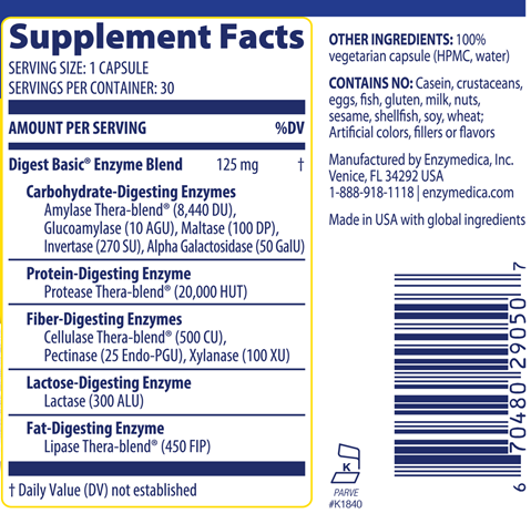 Recommended Use: 1 capsule with each meal. More may be taken as needed. For higher enzyme potency, Enzymedica’s Digest™ or Digest Gold™ may be helpful.