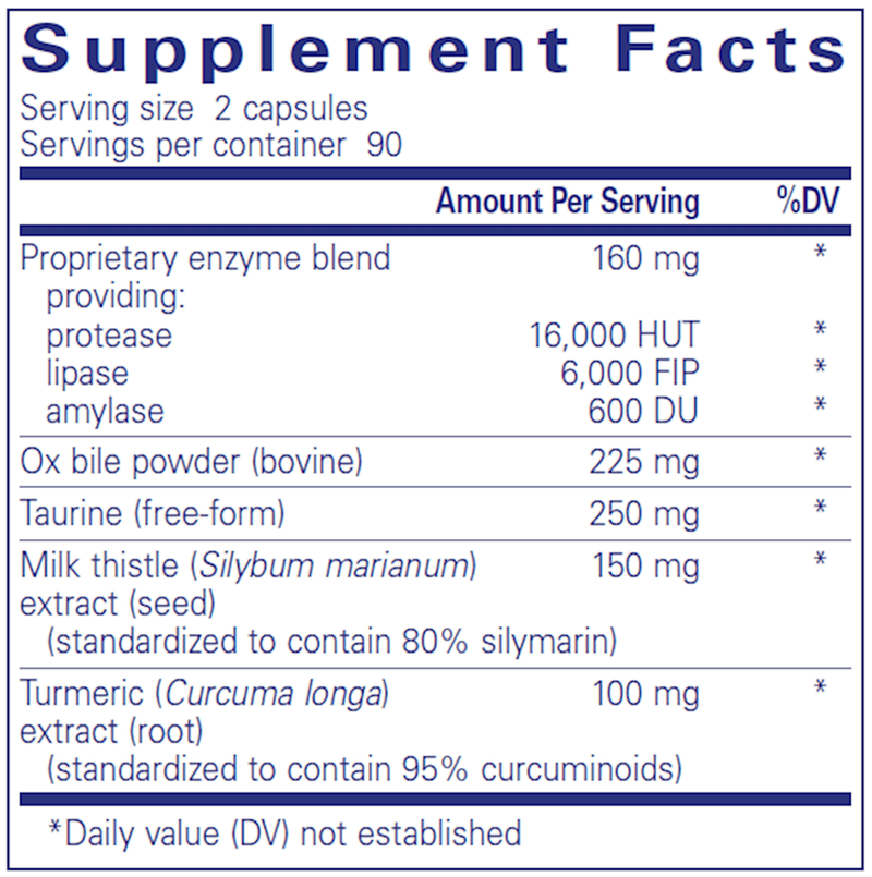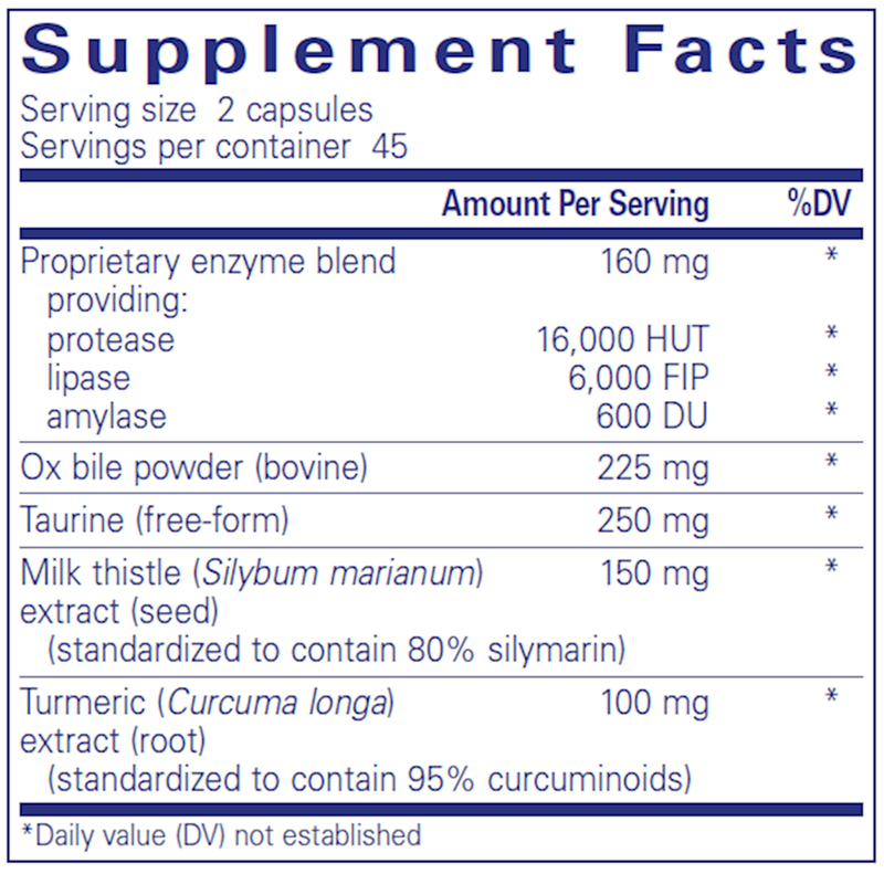 A unique mix of enzymes, bile salts, taurine and herbals to promote healthy gallbladder function and lipid utilization in addition to general digestive function.